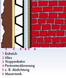 in vertical installation There TM-Geo-Tec is well-tried for being used together with bituminous thick coatings, Such as perimeter insulating boards, rigid or flexible sealing grouts. The knobs laid